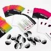 כולל: 50 קלפי שאלות, 12 קלפי הצבעה, 36 אסימונים, קוביית קטגוריות והוראות.